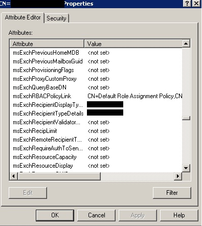 - Find the following attribute msExchRBACPolicyLink and set the path to the correct policy. You may want to copy the full value from another user that is correctly set.