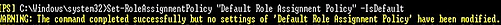As you can see by double-clicking on the image below the following powershell command was run and indicated that all users were set with the Default Role Assignment Policy.